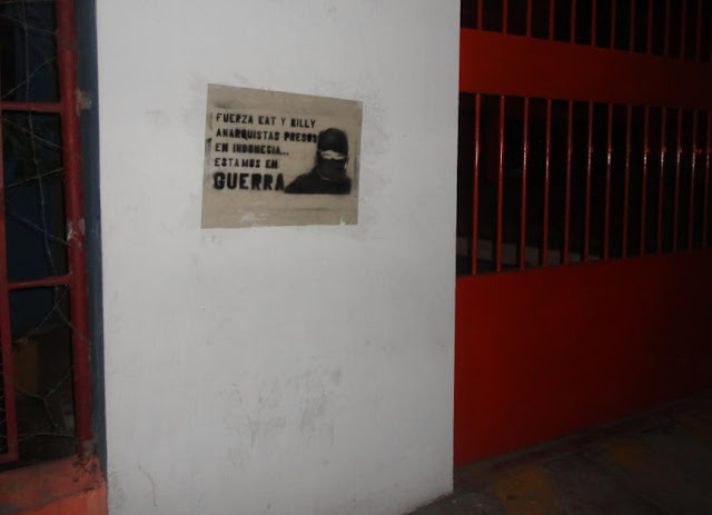 This may be a minimal action in solidarity with Eat and Billy, however the commitment to the anarchist goals of the FAI-FRI is permanent, in the struggle against the system in concrete terms, and that is what counts, solidarity now for […] those who show themselves in solidarity and affinity to determined struggles are persecuted and sentenced.