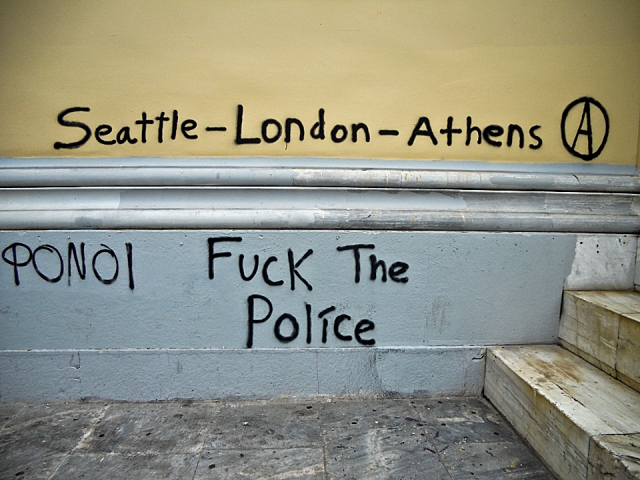 2) Have a manifestation, action, or other such gesture that is directly related to the struggle against the police in your own city or town. Information and leafleting about the situation in Athens will have little resonance there. Choose actions that will have the maximum resonance in your own geographical areas and help strengthen the international anarchist struggle against the police forces of each State.
